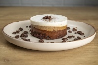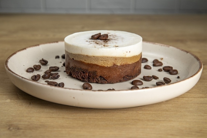 Блатът на тази торта е веган брауни с аромат на карамел. Върху него са подредени три различни крема от няколко вида шоколад с кафена нотка, подсладени с кленов сироп. Комбинация от качествени мазнини и натурални подсладители. Тази сурова и веган торта съчетава богатия вкус на шоколад и ароматно кафе.