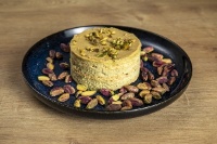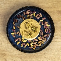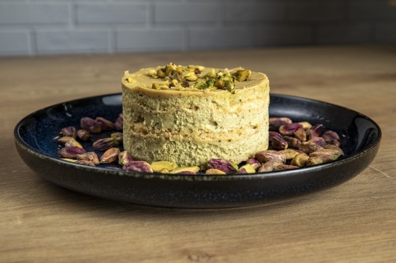 Бадемово брашно, стевия, ванилия, яйца, шам фъстък, маскарпоне, сметана. Тегло за мини торта 130 гр.