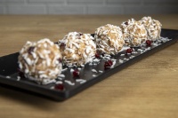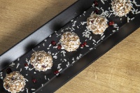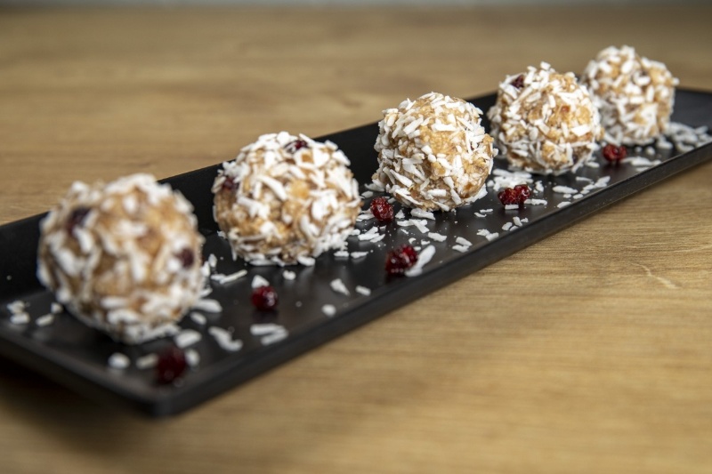 Изцяло веган и без глутен, тези бонбони са направени само от чисти съставки: фурми, безглутенови овесени ядки и кокосов тахан. Всяка хапка е балансирана експлозия от сладък кокос и леко тръпчива червена боровинка.