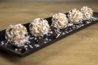 Kокосов тахан, безглутенови овесени ядки, фурми, кленов сироп, кокосово масло, кокосови стърготини, червени боровинки. Тегло 1 бонбон 20 г.