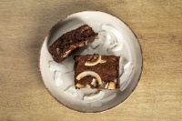 Черен шоколад Callebaut, бадемово брашно, какао, масло, орехи, кокосова захар, захар от фурми, яйца, филирани бадеми. Тегло за 1 брой 70 гр.