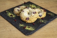 Хрупкава бисквитка без глутен със зелен чай матка и червени боровинки. Матчата е с високо съдържание на антиоксиданти