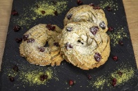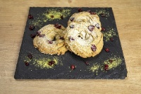 Безглутеново брашно, матча, краве масло, ванилия, тръстикова захар, червени боровинки,яйца.