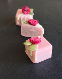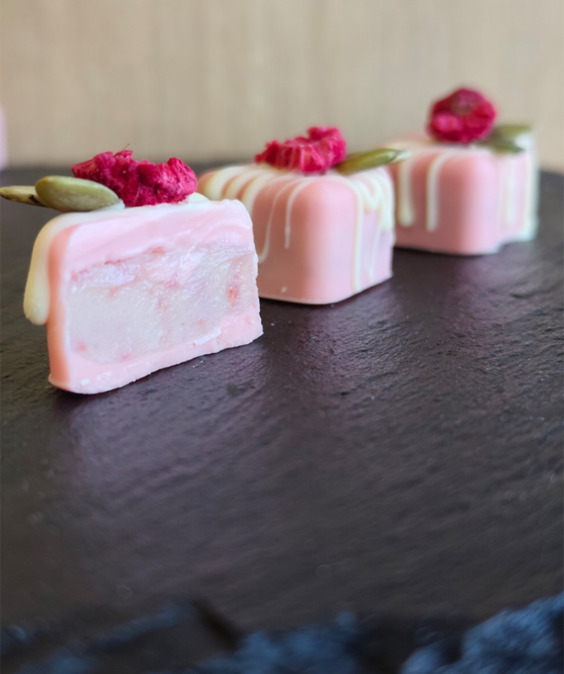 Насладете се на съвършената текстура! Този бонбон е създаден с богат и плътен пълнеж от сметана и крема сирене, който идеално контрастира с тръпчивите лиофилизирани малини. Всичко това е обвито в луксозен бял шоколад без добавена захар. Истинско блаженство!