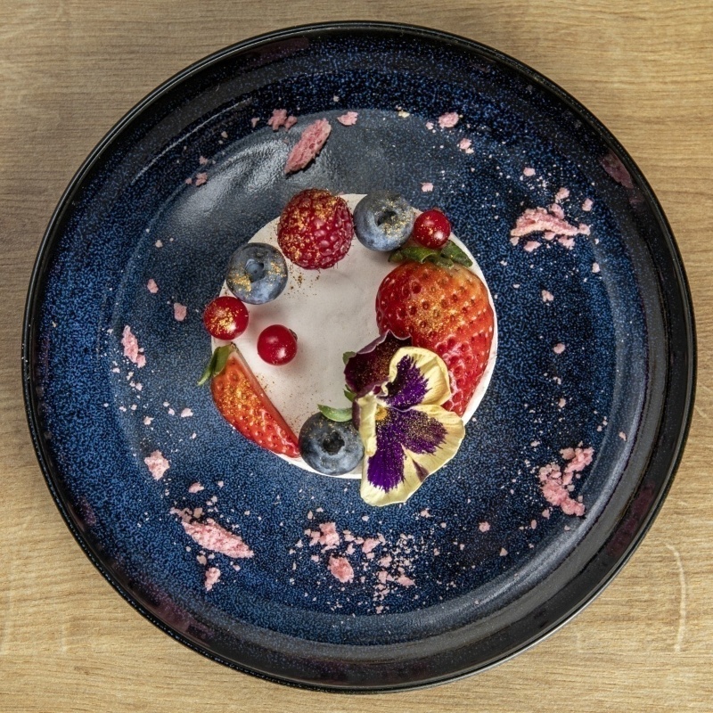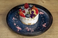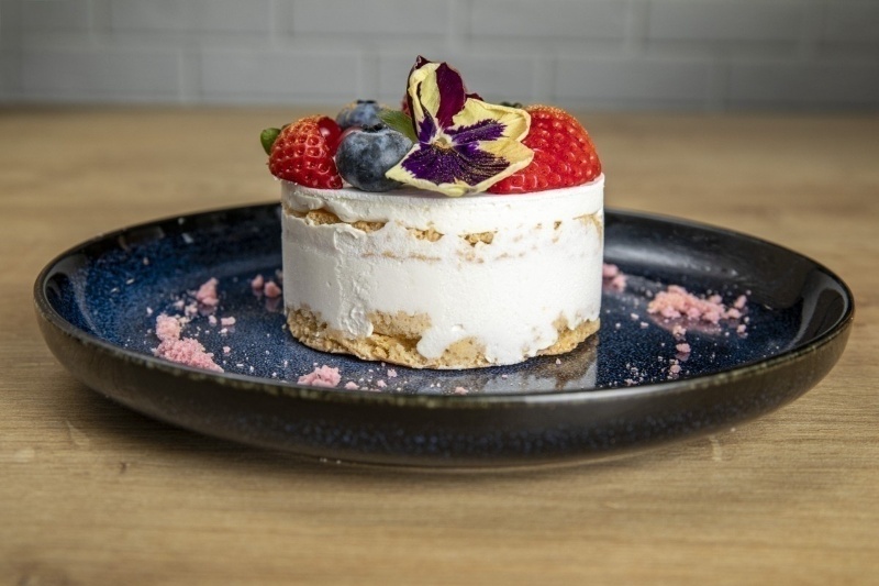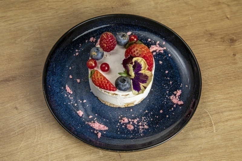 Пухкави блатове, приготвени от бадемово брашно с деликатен ядков вкус и сочна текстура. Ефирен крем от крема сирене придружен със свежи горски плодове. Използването на стевия гарантира перфектен вкус без излишни калории, поддържайки гликемичния индекс нисък.