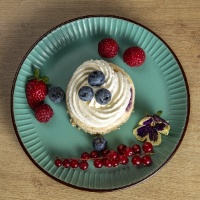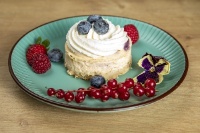 Бадемово брашно, яйца, крема сирене, краве масло,, кокосово брашно, боровинки, ванилия, стевия с еритритол. Тегло за мини торта 120 гр.