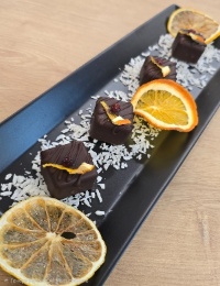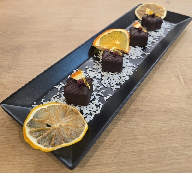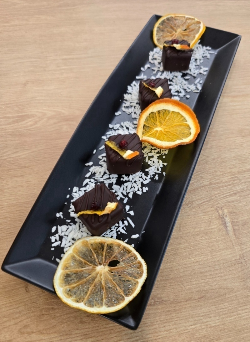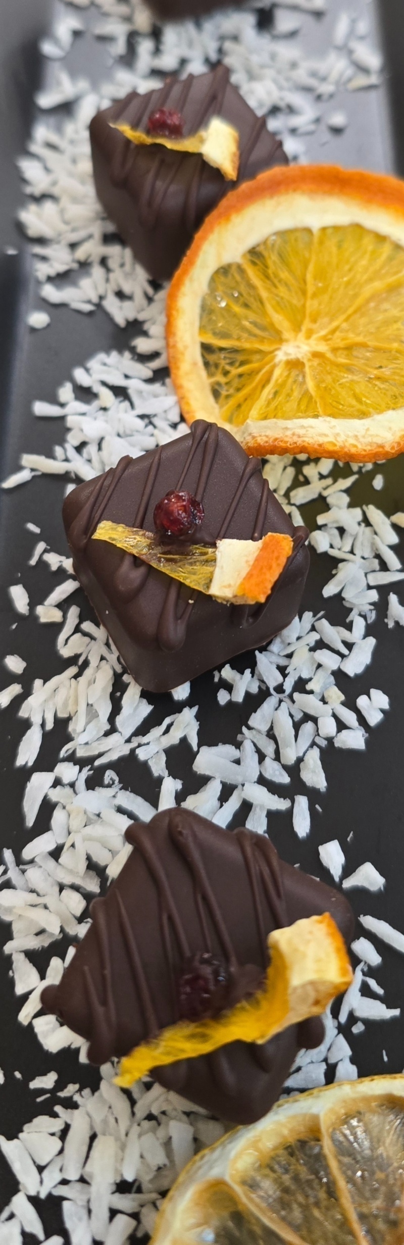 Пълнежът от портокалов мармалад и ганаш е обгърнат от черен шоколад Callebaut. Едно малко бижу за големи ценители! Нашият Портокалов бонбон е за тези, които обичат дръзките и балансирани вкусове.