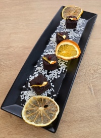 Портокалов мармалад, сметана, черен шоколад Callebaut.