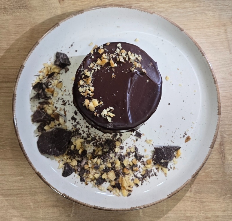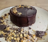 Черен шоколад Callebaut, млечен шоколад Гайо, тръстикова захар, краве масло, орех, яйца. Тегло за мини торта 120 гр.